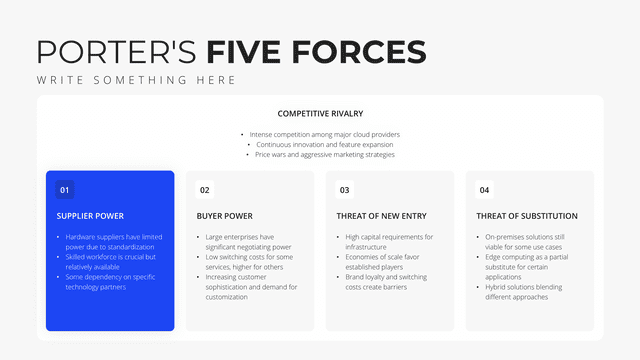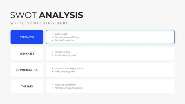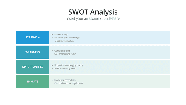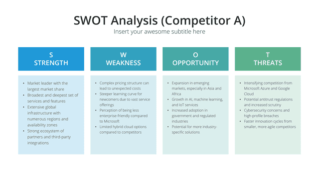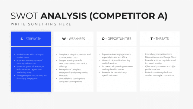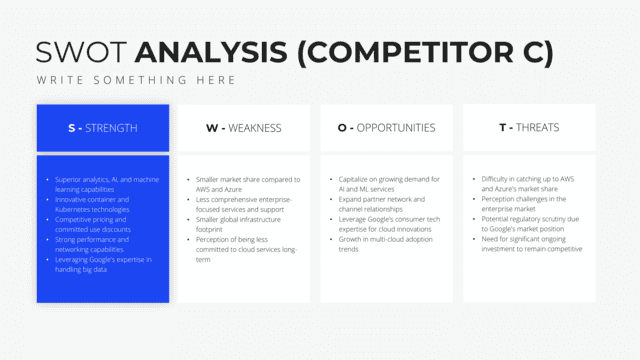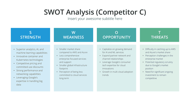 Gain insights into your market stance with the Competition Analysis slide. Tailored for a comprehensive view of competitors and market trends, this slide deciphers strengths, weaknesses, opportunities, and threats. By understanding the competition, businesses can strategize more effectively, carving out unique positions in the market.