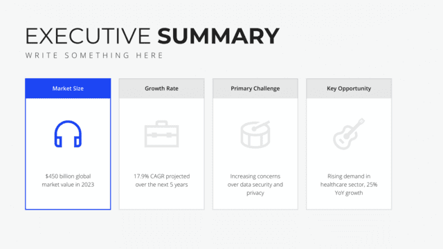 Offer a snapshot of your project or proposal with the Executive Summary slide. Designed to present key points, objectives, and outcomes in a concise manner, it sets the stage for deeper dives into specific areas. It’s essential for capturing attention and providing a quick overview of the topic at hand.