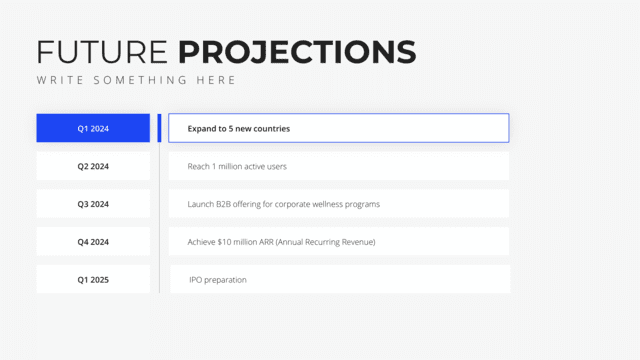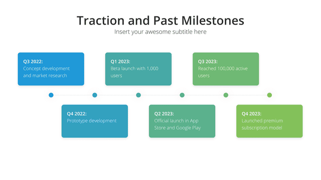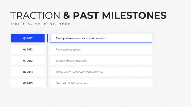 Chart out your organization’s significant moments with the Timeline slide. Designed to visually represent important milestones, achievements, and future plans, this slide provides a clear roadmap of your journey. It offers context, clarity, and a sense of progression, ensuring the audience understands and appreciates your growth trajectory.