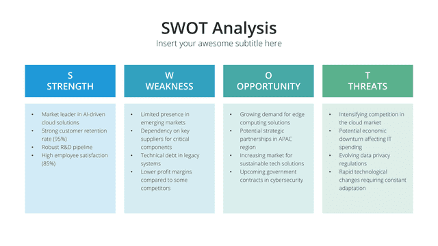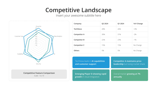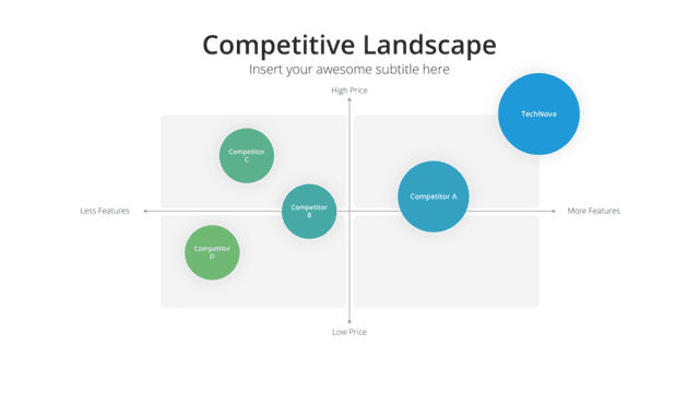 Gain insights into your market stance with the Competition Analysis slide. Tailored for a comprehensive view of competitors and market trends, this slide deciphers strengths, weaknesses, opportunities, and threats. By understanding the competition, businesses can strategize more effectively, carving out unique positions in the market.