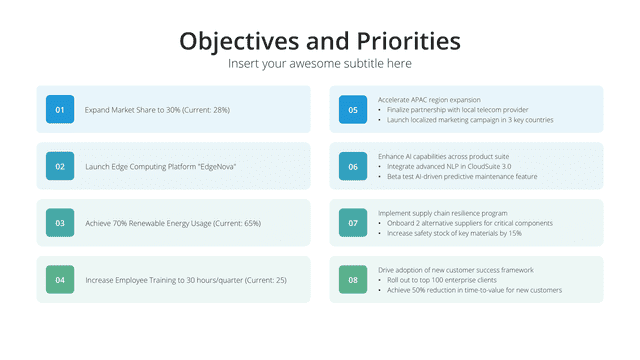 Guide your audience from start to finish with the Agenda slide. This slide is meticulously structured to outline all key talking points, ensuring clarity and setting the stage for the entire presentation. It ensures a smooth flow, keeping the audience engaged, informed, and aligned with the session’s objectives, fostering a cohesive experience.